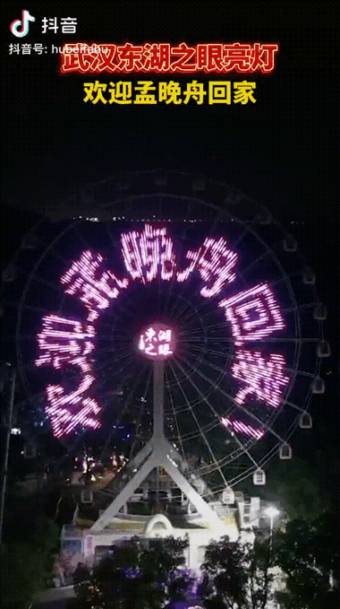 当晚,300架无人机点亮深圳夜空。广州、深圳、武汉等多地地标建筑也纷纷亮灯,欢迎孟晚舟回家。