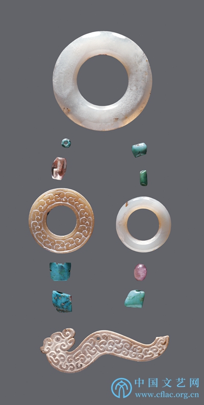 组玉佩为挂在腰间巿以上的饰物,虽然也基本出土于墓葬,但与覆面上的玉饰件性质完全不同,组玉佩大多数应是墓主人生前佩戴之物。《礼记·玉藻》有记:“古之君子必佩玉”“君子无故玉不去身”。在当时社会生活中,组玉佩是贵族身份在服饰上的体现之一,身份越高,组玉佩越长越复杂;身份较低者,配饰就简单而短小。这与当时贵族标榜的步态也有关系,身份越高,迈步越小,走得越慢,越显得气派出众,风度俨然。
