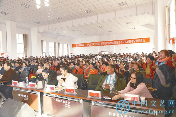 小分队还精心策划组织了一台集戏曲、曲艺、影视配音、书法为一体的文艺演出。在宁夏吴忠市上桥社区文化广场,小分队成员曹艾雯的昆曲《梨花颂》,北京青春鼓曲社曲艺演员周悦的京韵大鼓《万里春光》和《重整河山待后生》、青年京剧演员贾静的《金玉奴》唱段、宁夏吴忠市音乐家协会副主席赵红艳的《节日欢歌》、吴忠市农民花儿歌手王德勤的宁夏花儿《抓蚂蚱》《獐子吃草滚石崖》、秦腔演艺剧团歌手王慧的《王桂花纺线》选段以及高字民精彩的配音模仿秀和主持人张晓素、陈建忠深情朗诵的《枸杞花开》,博得观众的阵阵喝彩。大家意犹未尽时,现场还增设“点歌”环节,一曲《红灯记》唱段,在热烈的气氛中发酵升腾。演出中,宁夏的艺术家们也给观众带来极具本土特色的表演。有着“西北第一剪”之称的宁夏民间文艺家协会副主席伏兆娥即兴表演剪纸《剪春》,同时宁夏大学美术学院杨新林教授为大家作剪纸赏析。宁夏回乡文化园花儿歌手马少云和演员李小荣分别演绎了《花儿连唱》和眉户《梁秋燕》。宁夏的书法家宋琰、张涵、刘建明、陶毅也现场挥毫泼墨,为群众写春联、送“福”字。演出间隙还穿插了一系列猜谜语、出灯谜活动,现场观众情绪高涨、互动热烈。最后,在中国文艺评论家协会文艺志愿服务小分队一行集体演唱的歌曲《到人民中去》中圆满落幕。