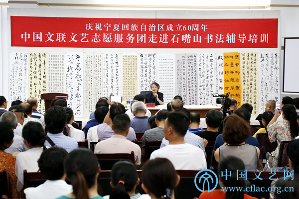 为庆祝宁夏回族自治区成立60周年,8月7日至10日,中国文联文艺志愿服务团将赴宁夏多地开展文艺志愿服务活动。8月7日晚,在石嘴山市举办了书法、音乐、舞蹈、电影、电视等辅导培训活动。图为中国书法家协会副主席刘洪彪主持书法辅导培训现场。中国文艺网 周春桃 摄