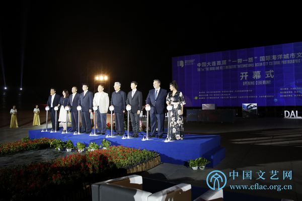 9月23日,由中国摄影家协会、中共大连市委宣传部和大连市旅游发展委员会联合主办的中国大连首届“一带一路”国际海洋城市文化摄影周开幕。图为与会嘉宾共同为活动启幕。中国文艺网 高晴摄