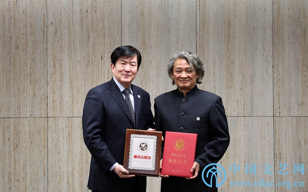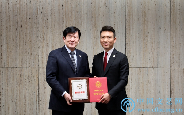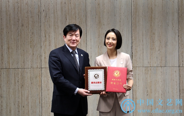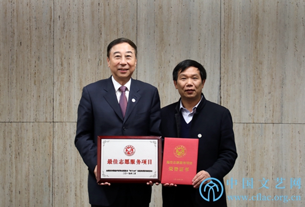 2月28日,中国文联党组领导会见学雷锋志愿服务“四个100”先进典型代表。图为中国文联党组书记、副主席李屹为“最佳志愿服务组织”浙江省杭州市富阳区文联文艺志愿服务团颁发证书、奖牌。中国文艺网 李哲 摄
