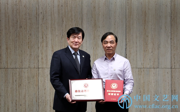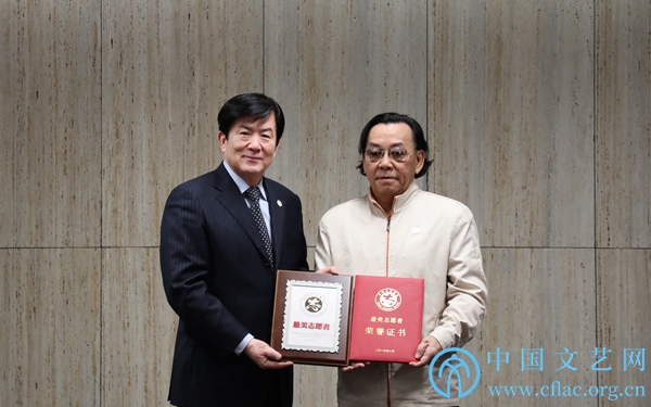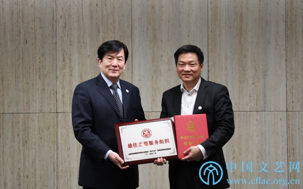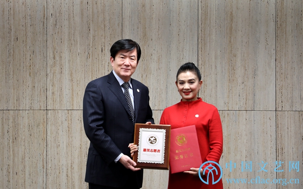 2月28日,中国文联党组领导会见学雷锋志愿服务“四个100”先进典型代表。图为中国文联党组书记、副主席李屹为“最佳志愿服务组织”广东省广州文艺志愿者协会颁发证书、奖牌。中国文艺网 李哲 摄
