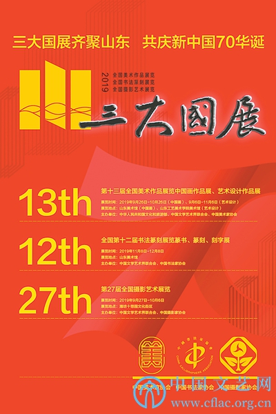 今年是中华人民共和国成立70周年,同时也是山东文化艺术界的喜庆年、丰收年。备受全国瞩目的第十三届全国美术作品展览中国画作品展、艺术设计作品展,全国第十二届书法篆刻展览篆书、篆刻、刻字展,第27届全国摄影艺术展览“三大国展”即将在山东举办。