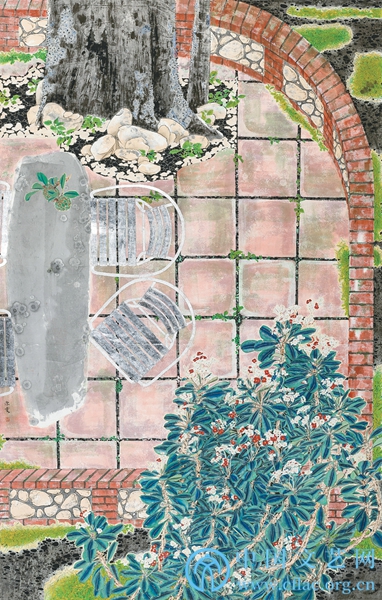 这张作品我想表现庭院里一花一草、一木一石、一砖一地等散发出来的春意和闲趣。构图上,“起、承、转、合”的惯性思量下,无意形成一个非封闭的“D”字形,恰好可以把现实生活中的事物“放进”理想的位置;视角上,试图采用“正视-俯视-正视”的散点透视塑造一种“游园”的视点转移;色彩上,我基本用了物象的固有色,因为简朴的砖红与带点青苔的翠绿吸引了我;技法上,我一直在工笔画原有的勾染体系基础上努力探索对工具、材料、技法、质感等的实验性尝试,希望通过崭新的“言语”道出心中最恰切的心象。