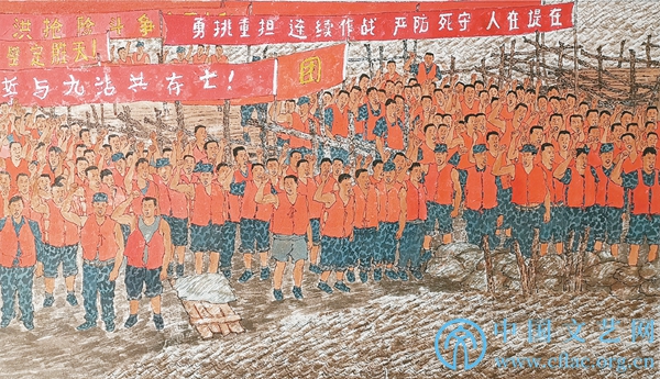 《九八抗洪》通过10幅连续性的绘画场景来表现1998年全民抗洪抢险这一重大的历史事件。画面以繁密而严谨的构图描绘了众多人物形象,场面恢宏,造成投鞭断流的气势。画中刻意减少传统文人画较小色差之间过渡和谐的“高灰调子”,强化现代中国画中的色彩对比,更加彰显“红色”的主旋律。选择抗洪题材进行创作,不仅是因为对国家的社会主义建设饱含热情,更是对这个伟大时代的英雄人物所表现出来的中国气派与民族精神充满深刻的文化认同。 (陈 勇)
