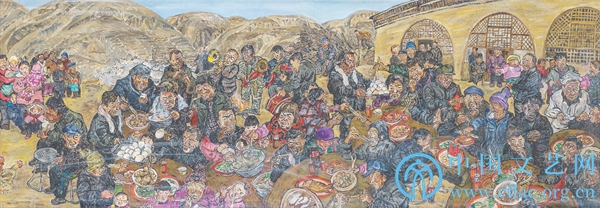 这张画取名为“我的黄土情”,因为8年前我独自一人前往陕北农村,住在老乡家的窑洞里,一待就是4年时间,天天与村民“同吃同住同劳动”,采风写生,当地村民都叫我“台湾画画娃娃”,让我感受到当地非常质朴、原生态的一面。这张画描绘的是陕北古老的“吃八碗”,我发现陕北有一种非常地道的中华文化精神,那就是苦中作乐。不论是陕北民歌、腰鼓、剪纸,都说明了在贫瘠的土地上,生命力顽强的人民不甘于苦,像驴那样倔强乐天地回应天与地。这里是大苦与大乐,用大红大火熔为一炉,把一粒粒粗糙的黄沙炼成一粒粒耀眼的金子。这点深深吸引着我,我想中国人的刻苦耐劳、乐天进取,正是中华民族数千年来饱含韧性的原因。