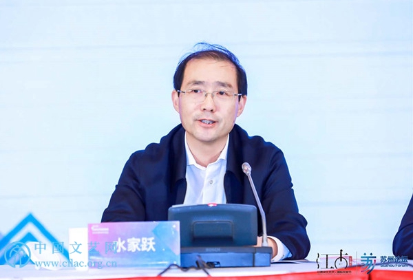 10月15日至17日,由中国文艺评论家协会、江苏省文联、苏州市委宣传部主办的2020 “在新时代的现场”当代文艺评论苏州论坛在苏州举行。图为江苏省文联党组书记、常务副主席、书记处第一书记水家跃在开幕式上致辞。
