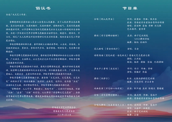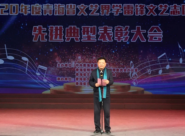 1月24日晚,由中共青海省委宣传部、省精神文明建设指导委员会办公室、省文学艺术界联合会主办的青海省文艺界学雷锋文艺志愿服务先进典型表彰活动在西宁群星剧场举办,马全、陈玉秀、屈巧哲、耿熙遥、习建林、王倩、刘建宁、陈有钧、路生贵、王洪波、贾国明、韩生辉、李政龙、李海东、侯梅才、陈有龙、邓旭峰、古明川、刘建平、岳柏阳等20位优秀文艺志愿者受到隆重表彰。