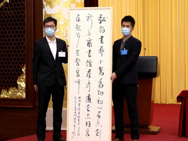 1月26日,中国书法家协会第八次全国代表大会在京召开。图为现场展示中国书协名誉主席沈鹏、张海为大会题写的庆贺诗作。