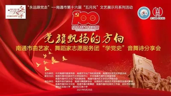 中国曲协微信公众号“曲艺杂志融媒”报道:江苏省南通市曲艺家、舞蹈家志愿服务团“学党史”音舞诗分享会在通州举行。40多名文艺家用心、用情、用歌、用舞、用诗、用艺术的形式与1500多名小学生分享“学党史”感悟。