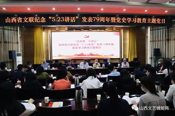 山西省文联召开 “忆峥嵘·守初心”——纪念“5•23讲话”发表79周年暨党史学习教育主题党日活动。活动旨在让广大党员干部进一步加深对理想信念的认识和理解,牢记文艺为人民服务的宗旨,推动党史学习教育走深走实。