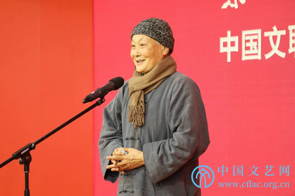 3月25日,“崇德尚艺、潜心耕耘——中国文联知名老艺术家艺术成就展”在中国文艺家之家展览馆开幕。图为中国曲协名誉主席罗扬致辞。