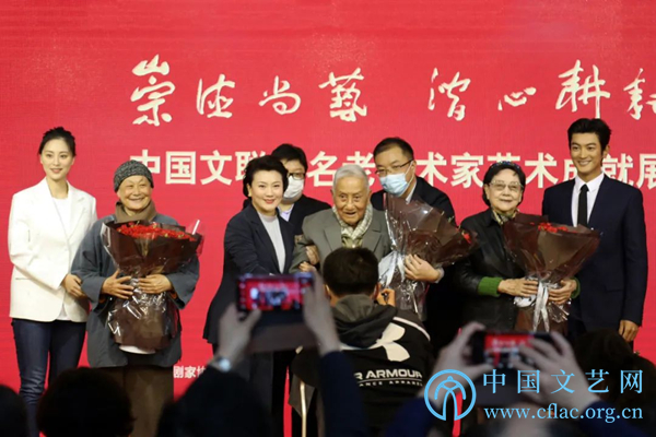 3月25日,“崇德尚艺、潜心耕耘——中国文联知名老艺术家艺术成就展”在中国文艺家之家展览馆开幕。图为中国剧协、中国影协、中国曲协青年演员代表邵天帅、杜江、杨菲为三位老艺术家献花。