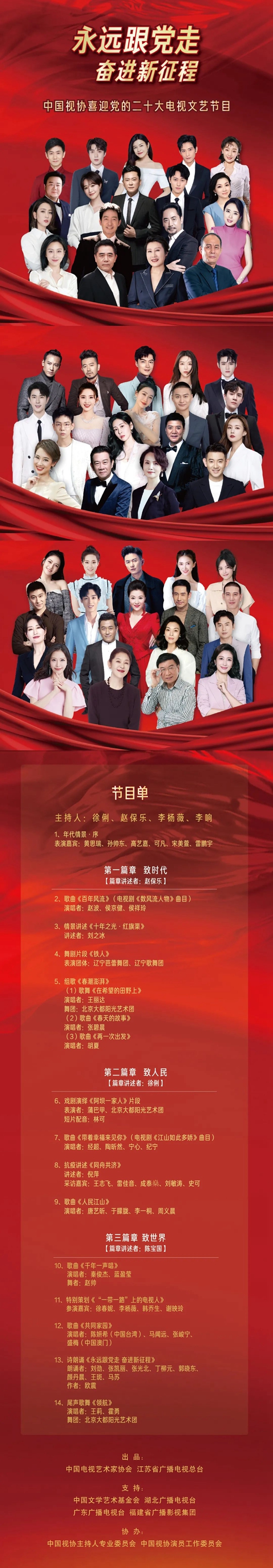 为迎接党的二十大胜利召开,以文艺的形式反映新时代中国在经济、政治、文化、社会、生态文明等各领域取得的光辉成就,展现广大电视和网络视听艺术工作者在党的领导下自觉承担举旗帜、聚民心、育新人、兴文化、展形象的使命任务和昂扬向上的精神风貌,由中国电视艺术家协会、江苏广播电视总台共同出品,中国文学艺术基金会、湖北广播电视台、广东广播电视台、福建省广播影视集团支持,中国视协主持人专业委员会、中国视协演员工作委员会协办的“永远跟党走 奋进新征程——中国视协喜迎党的二十大电视文艺节目”,已顺利完成录制工作,将于2022年10月10日起正式播出。