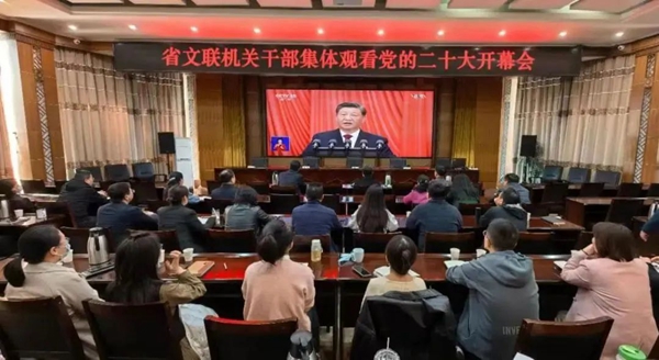 贵州省文联组织机关党员干部集中收看党的二十大开幕会盛况,聆听习近平总书记代表第十九届中央委员会向大会作的报告。大家一致表示,要把学习贯彻党的二十大精神作为当前和今后一个时期的首要政治任务抓紧抓实,进一步增强思想自觉和行动自觉,持续坚持以人民为中心的创作导向,推动中华优秀传统文化创造性转化、创新性发展,推出更多增强人民精神力量的优秀作品,为奋力谱写多彩贵州现代化建设新篇章贡献文艺力量。