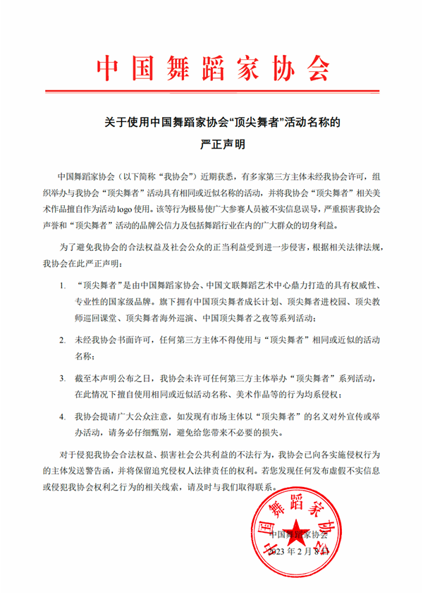 关于使用中国舞蹈家协会“顶尖舞者”活动名称的严正声明
