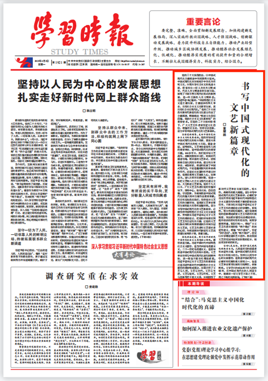 坚守人民立场,抒写中国式现代化的恢宏史诗。人民是历史的创造者和决定性力量,是中国式现代化的实践主体和根本动力。坚持以人民为中心的发展思想,是推进中国式现代化必须牢牢把握的重大原则之一,也是文艺事业繁荣发展的方向所在、命脉所系。文学艺术的成长离不开人民的哺育,在中国式现代化的人民奋斗中,蕴藏着一切文学艺术取之不尽、用之不竭的充沛源泉。奋力书写中国式现代化的文艺新篇章,必须坚持以人民为中心的创作导向,把人民放在心中最高位置,把人民满意不满意作为检验艺术的最高标准,把人民作为文艺服务对象、文艺表现的主体和文艺审美的最高评判者,倾情投入时代发展、社会进步的历史洪流,主动聚焦人民群众创造美好生活的火热实践,对人民推进中国式现代化的伟大进程和重大成就给予最热情的赞颂,对一切为实现中华民族伟大复兴奋斗的拼搏者、一切为人民牺牲奉献的英雄给予最深情的褒扬,以更多增强人民精神力量的优秀作品,全景式全方位史诗般展现中国式现代化的精神气象。