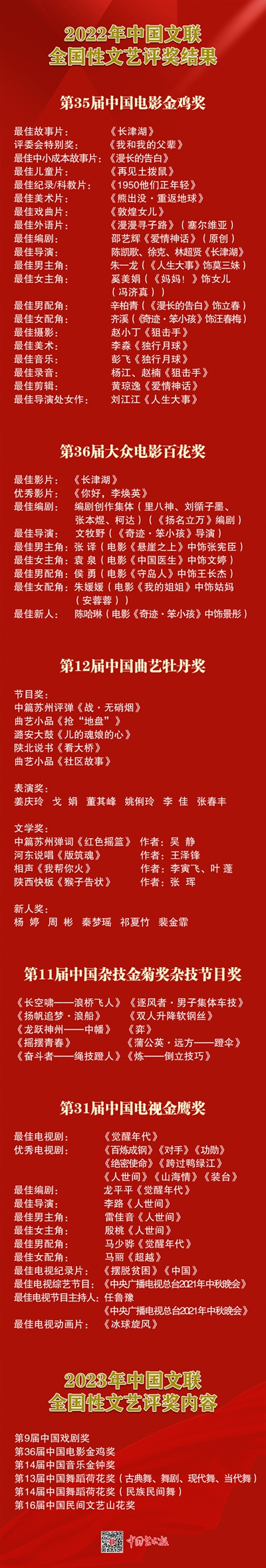 党的二十大擘画了“全面建设社会主义现代化国家的宏伟蓝图”的战略任务,强调坚持以人民为中心的创作导向,推出更加增强人民精神力量的优秀作品。落实好举旗帜、聚民心、育新人、兴文化、展形象的使命任务,中国文联将继续深化评奖改革,以更科学规范的体制机制、手段方式,发挥好评奖对创作的正向引导激励作用,鼓舞和引领文艺工作者,勇攀艺术创作高峰,努力为以中国式现代化全面推进中华民族伟大复兴,提供更为强劲的价值引导力、文化凝聚力、精神推动力。