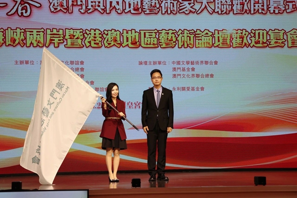 冀彦伟代表中国文艺志愿者协会向澳门文艺志愿者协会授旗