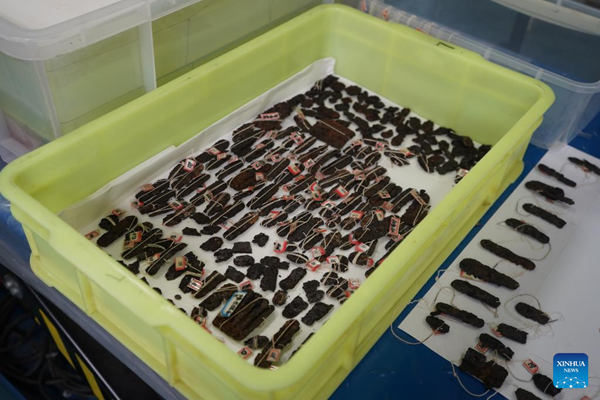 Photo taken on March 30, 2022 shows individual plates in different sizes of the first complete set of the Tang Dynasty (618-907) iron armor unearthed from the tomb complex of Tuyuhun royal families in Wuwei City, northwest China's Gansu Province.(Xinhua/Lang Bingbing)