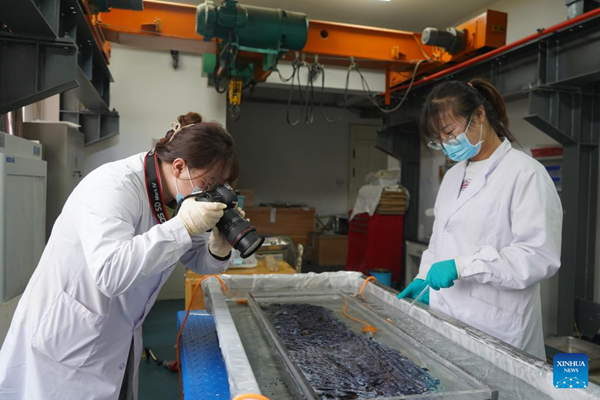 A researcher desalts the first complete set of unearthed Tang Dynasty (618-907) iron armor while the other records the process in the laboratory of the Gansu provincial institute of cultural relics and archaeology in Lanzhou, northwest China's Gansu Province, March 30, 2022.(Xinhua/Lang Bingbing)