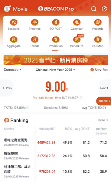 As of 14:11 on February 4, China's 2025 Spring Festival box office (including pre-sales) has soared past the 9 billion yuan mark (around $1.24 billion), according to movie data platform Beacon Pro.