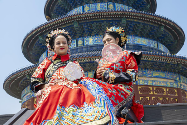 Foreign tourists wearing hanfu, or traditional Chinese attire, visit the Temple of Heaven, a UNESCO World Heritage site, in Beijing’s Dongcheng district on May 29. CHEN QIANG / FOR CHINA DAILY