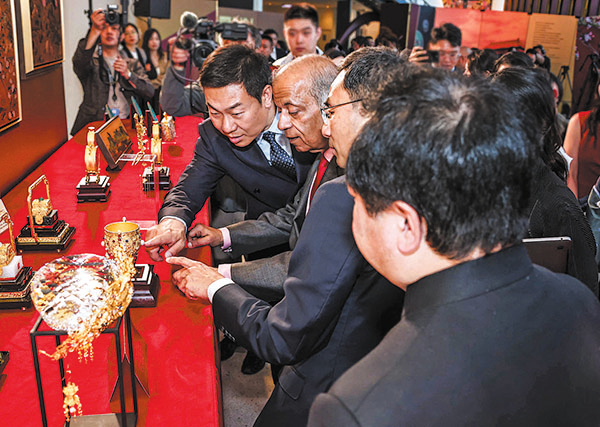 Wu Di (left), head of the Palace Museum's cultural and creative products department, shows guests a relic during an exhibition held at the UN's New York headquarters on May 19. [Photo provided to China Daily]