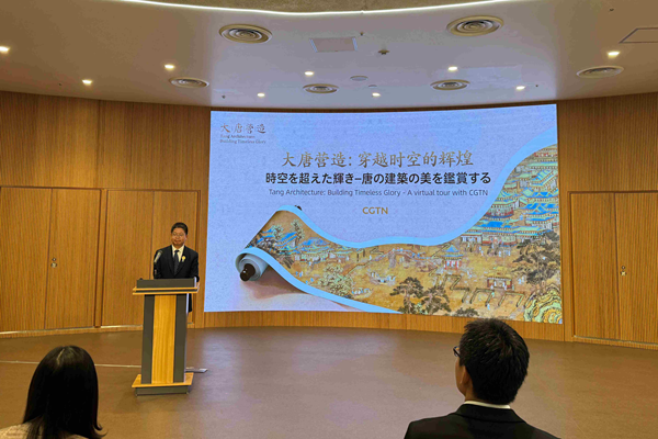 The Japanese edition of CGTN's latest multimedia immersive and interactive virtual exhibition, "Tang Architecture: Building Timeless Glory," was showcased on Saturday at the China Pavilion at the Expo 2025 in Osaka, Japan.