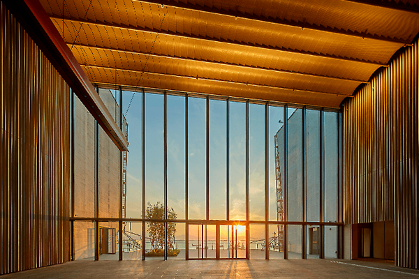 博物馆于地面、二楼及四楼设有三个分别面向西九文化区、维港和大屿山的中庭,游客步入其中、移步换景,可多方位领略香江美景。无论是地面大堂中庭参照紫禁城屋顶琉璃瓦设计的金色天花,亦或是红色正大门上整齐排列的玻璃门钉,都在传统中蕴含着独树一帜的现代风格,令整座博物馆随着时空转换,流光溢彩,展露生机。