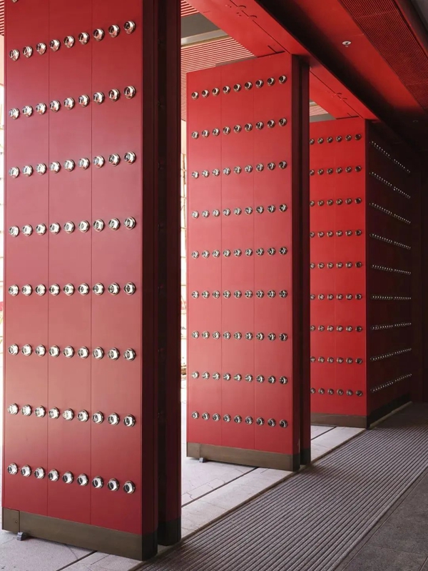 据香港故宫设计师严迅奇介绍,大门上的门钉传统是用金属门钉,但香港故宫文化博物馆是用的玻璃,目的是希望门关了之后,夜晚闭馆了,里面依然有灯。这些光就可以慢慢通过玻璃砖渗出来,给人的感觉就好像这个馆虽然关了门,都继续有生命力存在。建筑的外墙吸收阳光,不同角度的阳光不同,可以达到很多不同的视觉效果。例如阳光从低角度照射它的时候,它表面就会呈现一个很柔和的色彩。如果阳光从高角度照射它的时候,就会有小小的闪光效果。