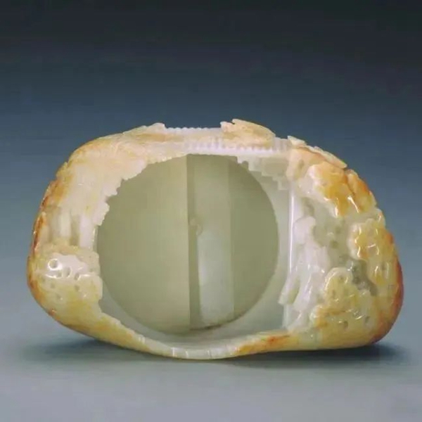 山子为文房常见的陈设品。此山子底部镌有乾隆的款识及题诗各一,可知原玉本为和阗所贡,中间的部分被挖出以制碗。但经过一位佚名的苏州玉工把本应弃置的玉材重新设计,如将挖去的圆洞化为桐荫蔽天的月门,未经打磨的玉皮点缀为梧桐、蕉叶,从而制成此巧夺天工的工艺品。