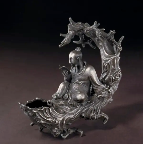 “槎”即木筏。据西晋张华《博物志》所记,曾有人乘槎出海,最后上达银河,与牛郎织女相遇。以传说中的槎为器型,制作饮具,可能为元代银匠朱碧山首创,今日仅存四只。此杯造型模仿盘根错节的树干,中空的树干内可以盛酒。槎杯的主要部分由银铸造而成,细部用錾刻工艺表现,人物的头、手等部分均是独立铸造之后,再焊接在杯上,接焊之处混然无迹,既是实用的饮器,亦是巧夺天工的雕塑。