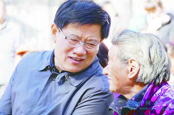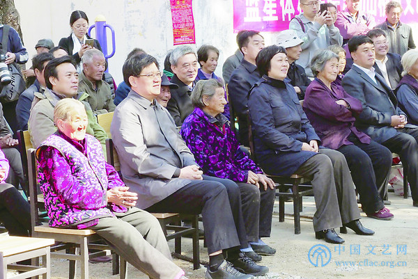 山东省文联党组书记王世农陪山桥村93岁的朱传英老人看戏并亲切交谈