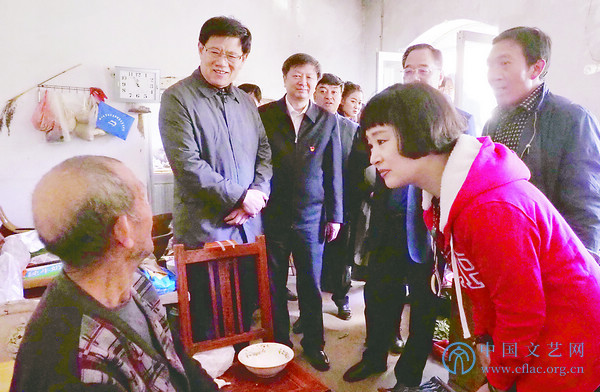 山东省文联领导和文艺家们带着慰问品看望因腿脚不便无法看戏的山桥村村民李有恭并现场演唱五音戏