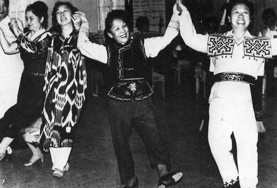 图为戴爱莲在组织民间舞蹈“人人跳”活动。戴爱莲毕生致力于舞蹈艺术的推广,这种“人人跳”舞蹈普及性强,尤其受到戴爱莲的喜爱、重视,戴爱莲去世后,她的众多生前好友在悼念活动现场也跳起了这种舞蹈,以表达对这位前辈艺术家的崇敬。