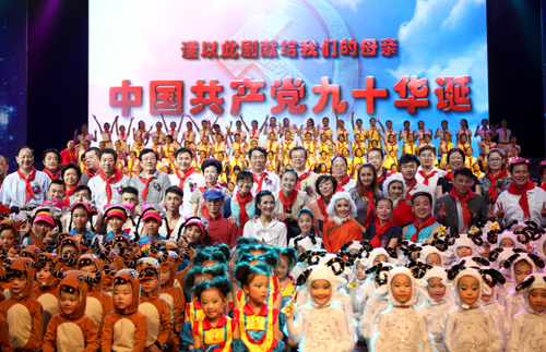 6月28日晚,由四川省文联和四川省教育厅主办、四川省舞协等单位承办、四川省少儿舞蹈直通车艺术团倾力创作的,为庆祝中国共产党成立九十周年大型红色经典少儿情景歌舞剧《红色少年》在成都娇子剧场华彩上演。图为演出结束后,观看演出的领导与演职人员合影留念。邓风 摄
