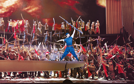 陈:这些情节都是历史的经典,是不可回避的,这就像是一个命题作文,看大家都用什么不同的方法来表现。像“红军爬雪山过草地”,我们采取的还是歌舞两种艺术形式的情景交融,戏剧性强化的处理方式。在这段故事中出现了一个小战士,他是在风雨交加的长征路上面对即将初升的太阳,在党旗下宣誓入党的。小战士突出人物化的处理,同其他战士们共同演唱这首歌曲时,“红军爬雪山过草地”的老故事就换了新颜。党旗作为主题形象贯穿全剧始终。从“序”的党旗覆盖中国大地,到红军长征中那面战火硝烟中的党旗,再到新时期党员入党宣誓共同面对的党旗,“旗帜”的形象不断出现。