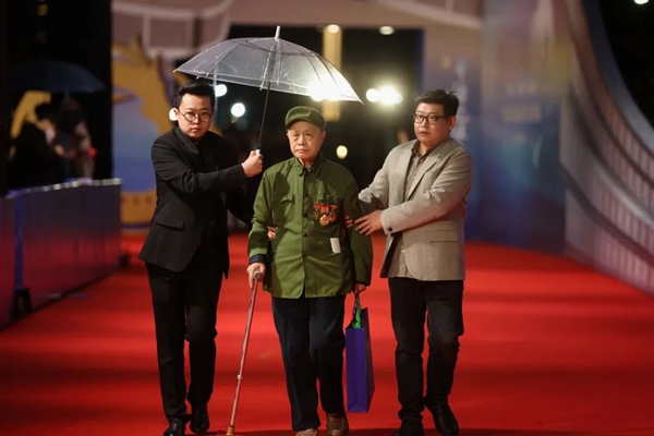抗美援朝老兵周忠杰和纪录电影主创们红毯亮相