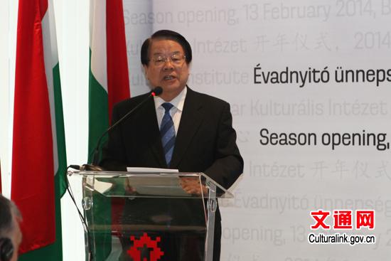 蔡武在致辞中首先回顾了中匈两国65年来文化交往的历史和成绩并热烈祝贺匈牙利中心作为首个中东欧国家在华设立的文化中心揭牌并运营。他说,文化中心的设立是两国民众“零距离”接触的便捷平台,将为深化两国文化交流发挥重要作用。中匈都是本地区的文化大国,两国开展文化交流的基础雄厚,前景广阔,两国人民渴望相互了解的愿望真诚而强烈。在谈及未来如何深化和促进两国文化交流时,蔡武从文化交流的内容、方式以及参与的主体等方面分析了当前文化交流的新形势并提出五点建议。2014年是中匈建交65周年,蔡武表示,中方愿以此为契机,努力使各项文化活动办出特色、办出影响、办出效应,将两国和两国人民之间业已存在的传统友谊发扬光大。