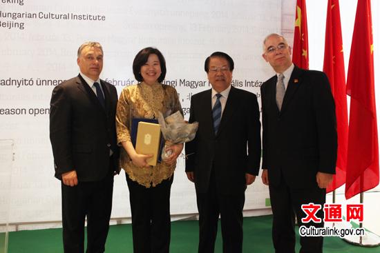 致辞结束后,在欧尔班总理和蔡武部长的见证下,匈牙利人力资源部部长鲍洛格·佐尔坦向华裔钢琴家克劳迪娅·杨颁发了“匈牙利文化奖”。据悉,该奖是匈牙利政府为表彰对匈牙利文化做出突出贡献的国外文化界人士而设立的政府最高奖项。克劳迪娅·杨女士因在李斯特音乐作品的诠释和演绎方面取得的杰出成就而荣获该奖。