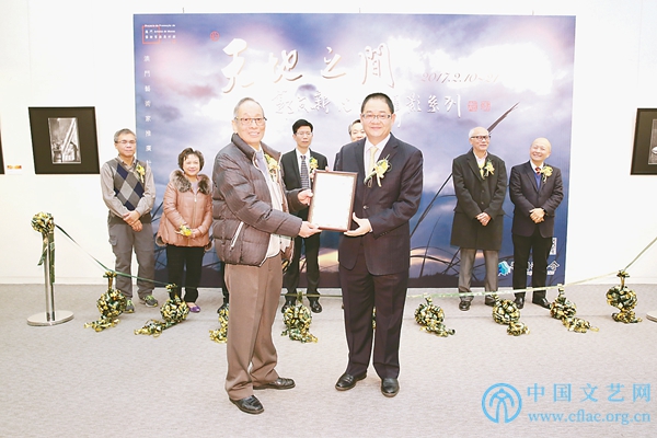 “艺推”计划中,澳门基金会行政委员会主席吴志良(右)向摄影家郭向新颁发作品收藏证书