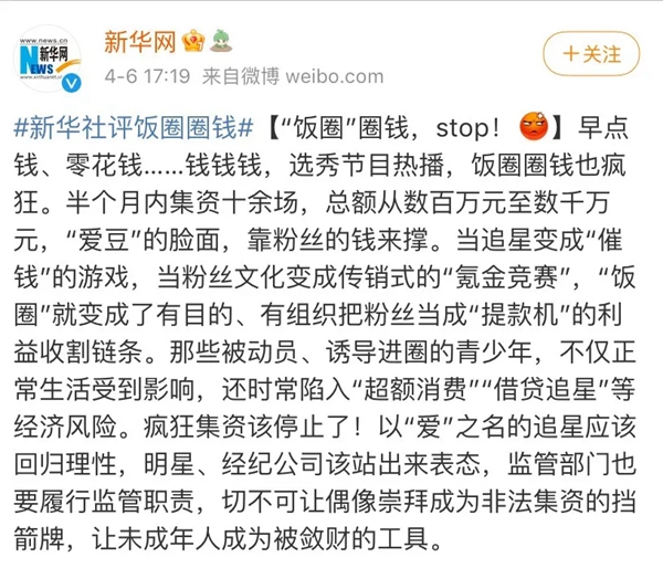 新华网评“饭圈”圈钱,“爱豆”的脸面,靠粉丝的钱来撑。当追星变成“催钱”的游戏,当粉丝文化变成传销式的“氪金竞赛”,以“爱”之名的追星应该回归理性!
