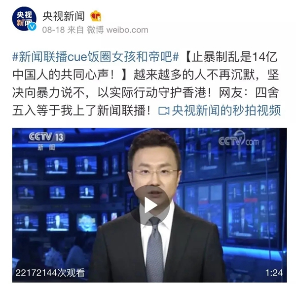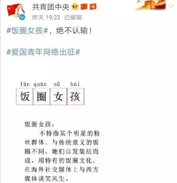 2019年“饭圈女孩”与帝吧网友携手出征,发起爱国援港活动,“开撕”激进示威者,这群追星追出的专业舆论“备战军”,自发集结成了数量庞大的 “网络远征军”,联合出征各大海外社交平台。合作默契、分工明确,迅速占领评论区制高点、霸屏相关话题图库,还原香港各种暴力冲突事件的真相,只为“守护全世界最好的阿中(中国)”。以特有的饭圈文化给港独分子们上了一堂精彩生动的“爱国主义教育课”。