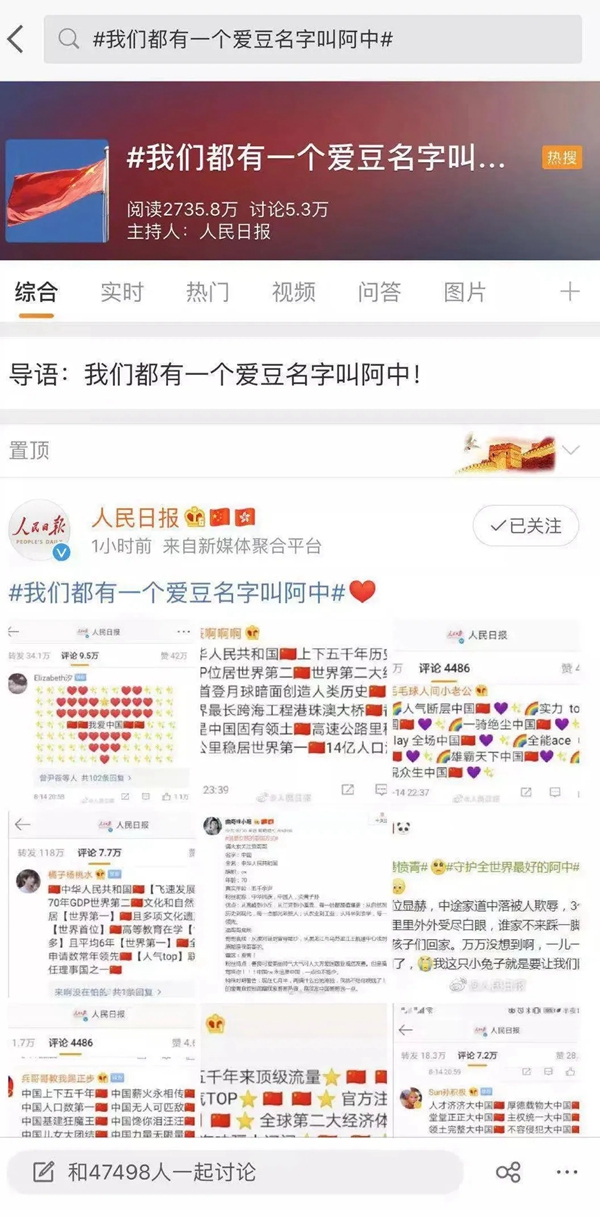 #饭圈女孩出征##守护全世界最好的阿中##我们都有一个爱豆名字叫阿中#等话题登上热搜,共青团中央、人民日报、新闻联播等纷纷为其点赞。“守护最好的阿中”事件让全网感受到了“饭圈女孩”们超强的组织力、凝聚力以及专业素养能力。