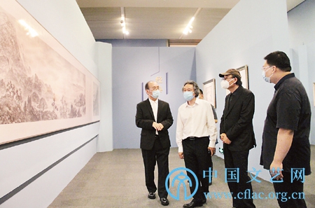 尹毅(左一)向中国美协分党组书记、驻会副主席、秘书长马锋辉(左二)和中国国家博物馆副馆长刘万鸣(左三)介绍展览情况