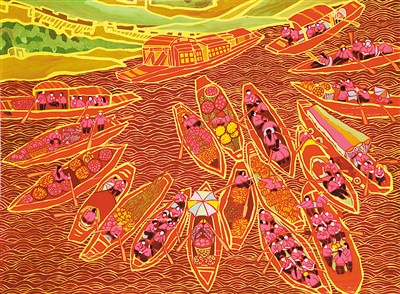 有了主题,何小宝却为创作的切入点发愁。一天,他在北运河边转悠,偶然看见两只相向而行、满载而归的渔船。那一瞬间,灵感来了。“想到我们今天的美好生活,想到中国共产党的百年历史,想到嘉兴南湖上的红船,想到乡村振兴的成果……于是便有了《盛会》这张作品。”何小宝说。