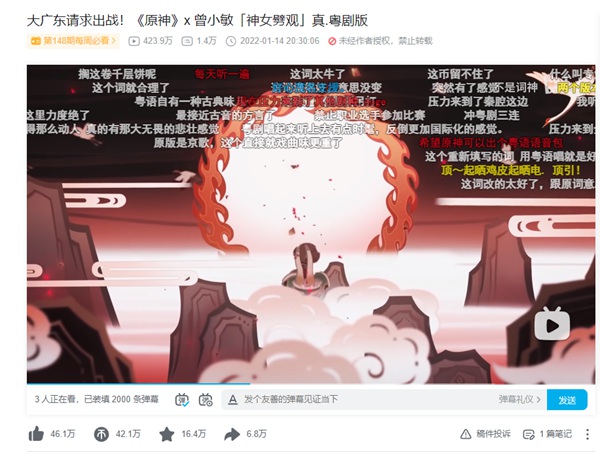 今年1月,游戏《原神》PV《神女劈观》的京剧戏腔引发海内外玩家的讨论,带动了大家对戏曲的关注,于是,曾小敏趁着这波热度,和知名音乐创作者“不是词神”合作创作了粤剧版《神女劈观》,大获好评,吸引了戏曲“国家队”纷纷下场,许多剧种参与到二创风潮中来。