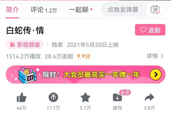 由此,这一流传千百年的经典爱情故事变得容易被年轻人理解,纵然有珠玉在前,这部电影也依然令人共情共鸣。电影上线年轻人聚集的B站后,获得热烈追捧,截至目前,已经获得1500多万次的播放量,5.4万条弹幕和1.2万条评论,足以见得这部戏曲电影在年轻人中间激起的波澜。